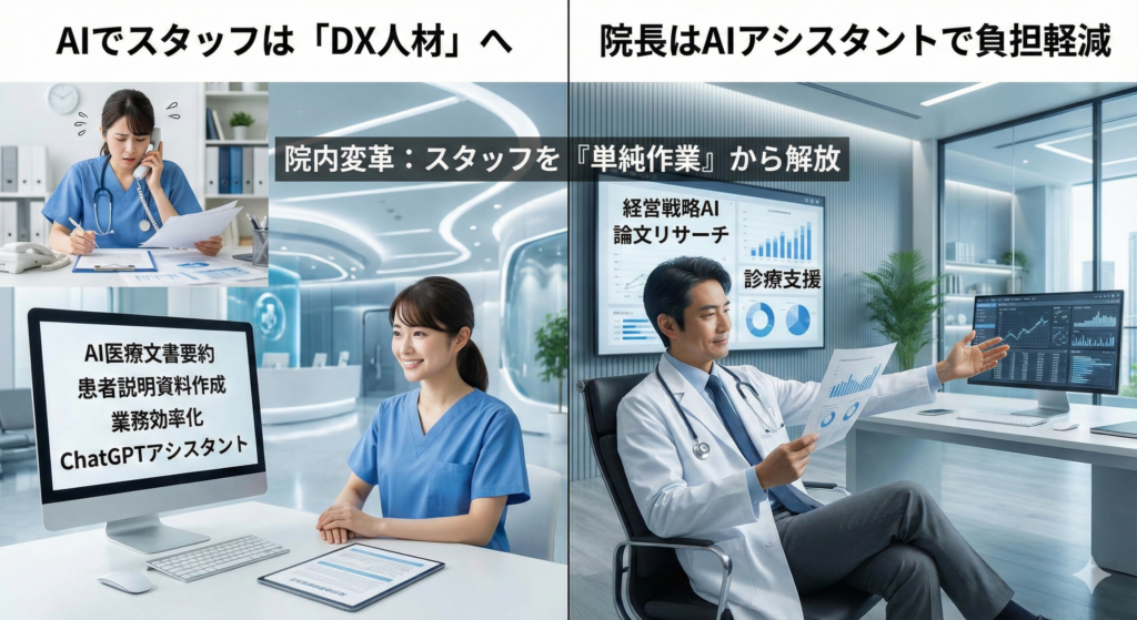 AIを“パートナーとして雇う”発想を入れると、院内の空気が変わります。AIは「人の代わり」ではなく、院内の“作業を吸い取る存在”として機能します