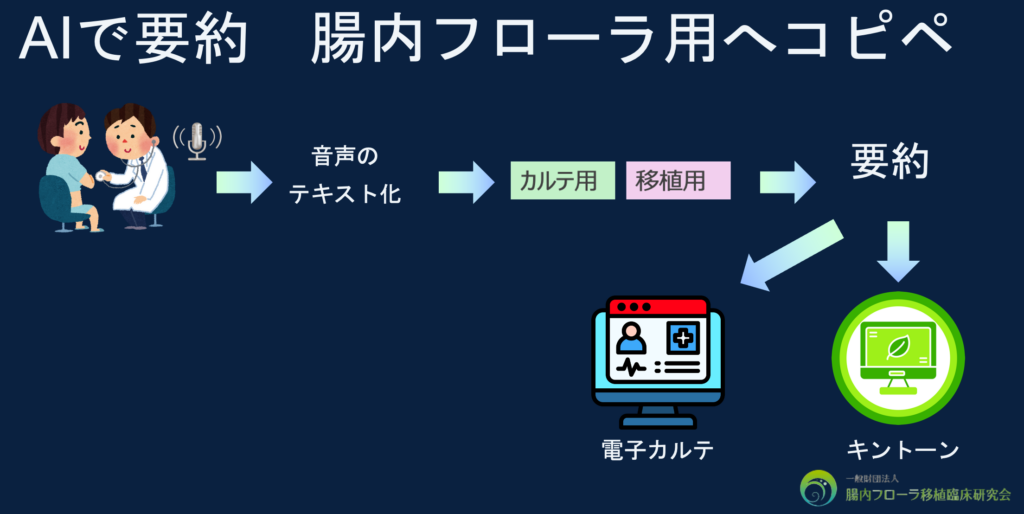 腸内フローラ移植臨床研究会カルテ(キントーン):電子カルテのSOAPに変換したその会話を元に『腸内フローラ用』ボタンで腸内フローラ磯供養のSOAPに変化しますので、そのテキストをコピーしてキントーンへペーストするだけ。